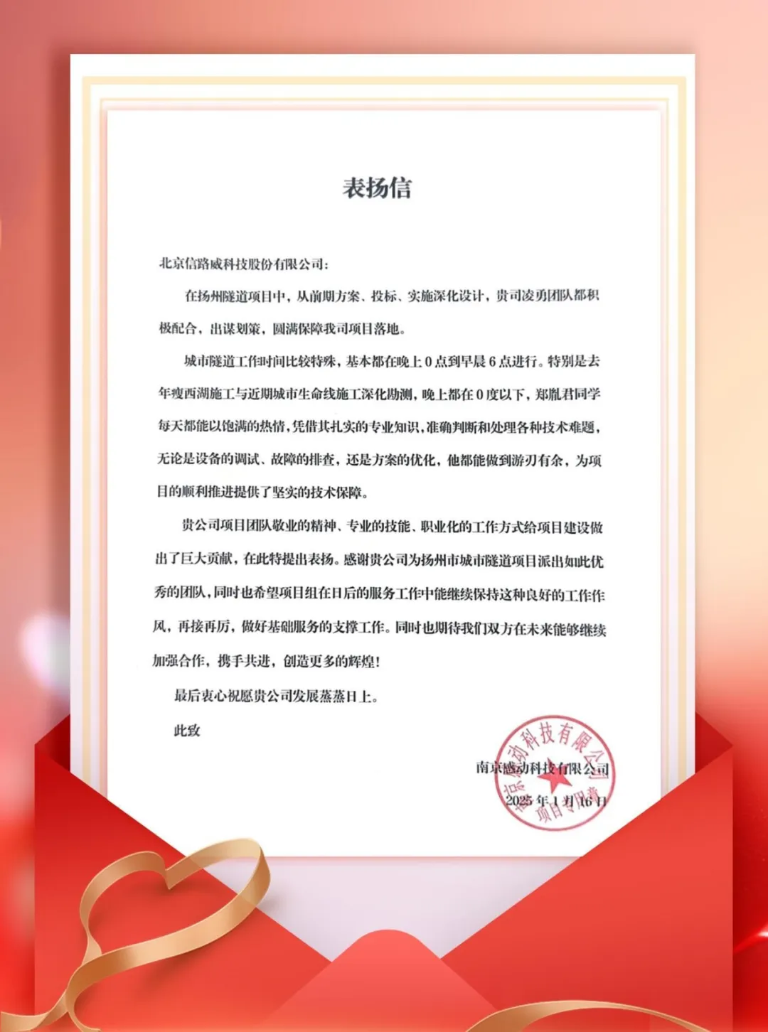 近日,信路威收到南京感動科技有限公司發(fā)來的表揚信。信中對信路威項目團隊在揚州隧道項目建設(shè)過程中體現(xiàn)出的專業(yè)技術(shù)水平進行了點贊,對項目組技術(shù)人員在艱難條件下兢兢業(yè)業(yè)的工作熱情給予了高度評價和贊譽。