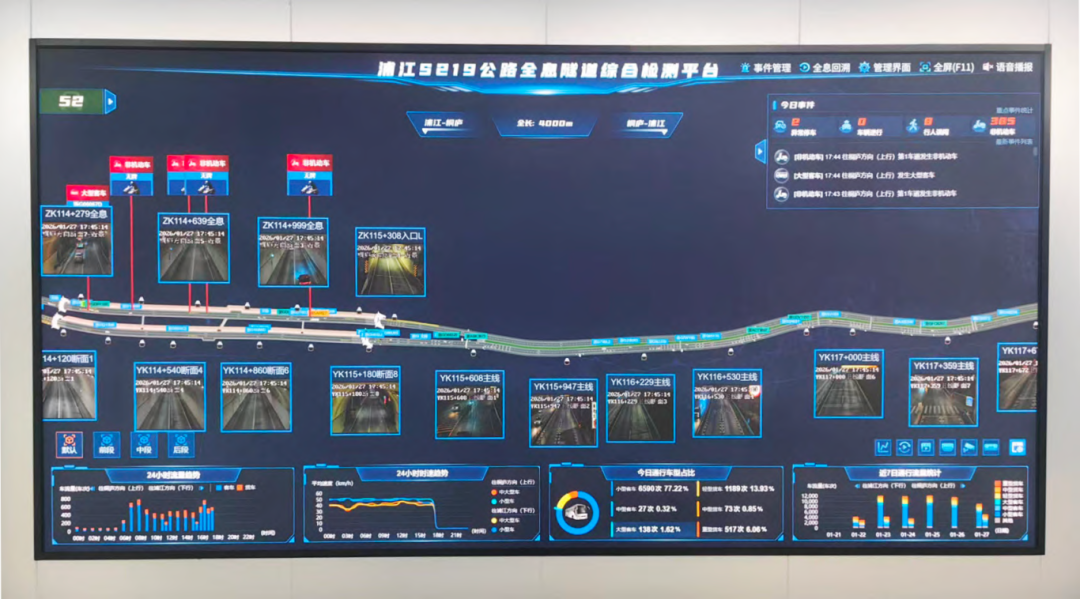 以全息感知與數(shù)字孿生技術(shù),賦能路段的數(shù)智化管理。該路段廣泛部署全息感知設(shè)備,并融合數(shù)字孿生技術(shù),構(gòu)建了2.5公里三維可視化全息隧道綜合檢測平臺(tái),此平臺(tái)能夠?qū)崟r(shí)精準(zhǔn)監(jiān)測交通運(yùn)行狀態(tài),實(shí)現(xiàn)對車輛軌跡、交通事件的秒級識(shí)別與動(dòng)態(tài)跟蹤,全面增強(qiáng)了路段運(yùn)行的“可知、可管、可控”能力。