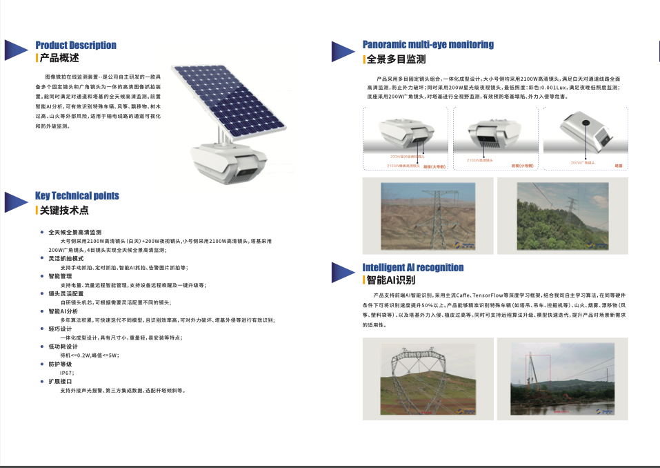 圖像微拍在線監(jiān)測裝置--是信路威自主研發(fā)的一款具備多個固定鏡頭和廣角鏡頭為一體的高清圖像抓拍裝置。能同時滿足對通道和塔基的全天候高清監(jiān)測。前置智能AI分析,可有效識別特殊車輛、風(fēng)箏、飄移物、樹木過高、山火等外部風(fēng)險,適用于輸電線路的通道可視化和防外破監(jiān)測。